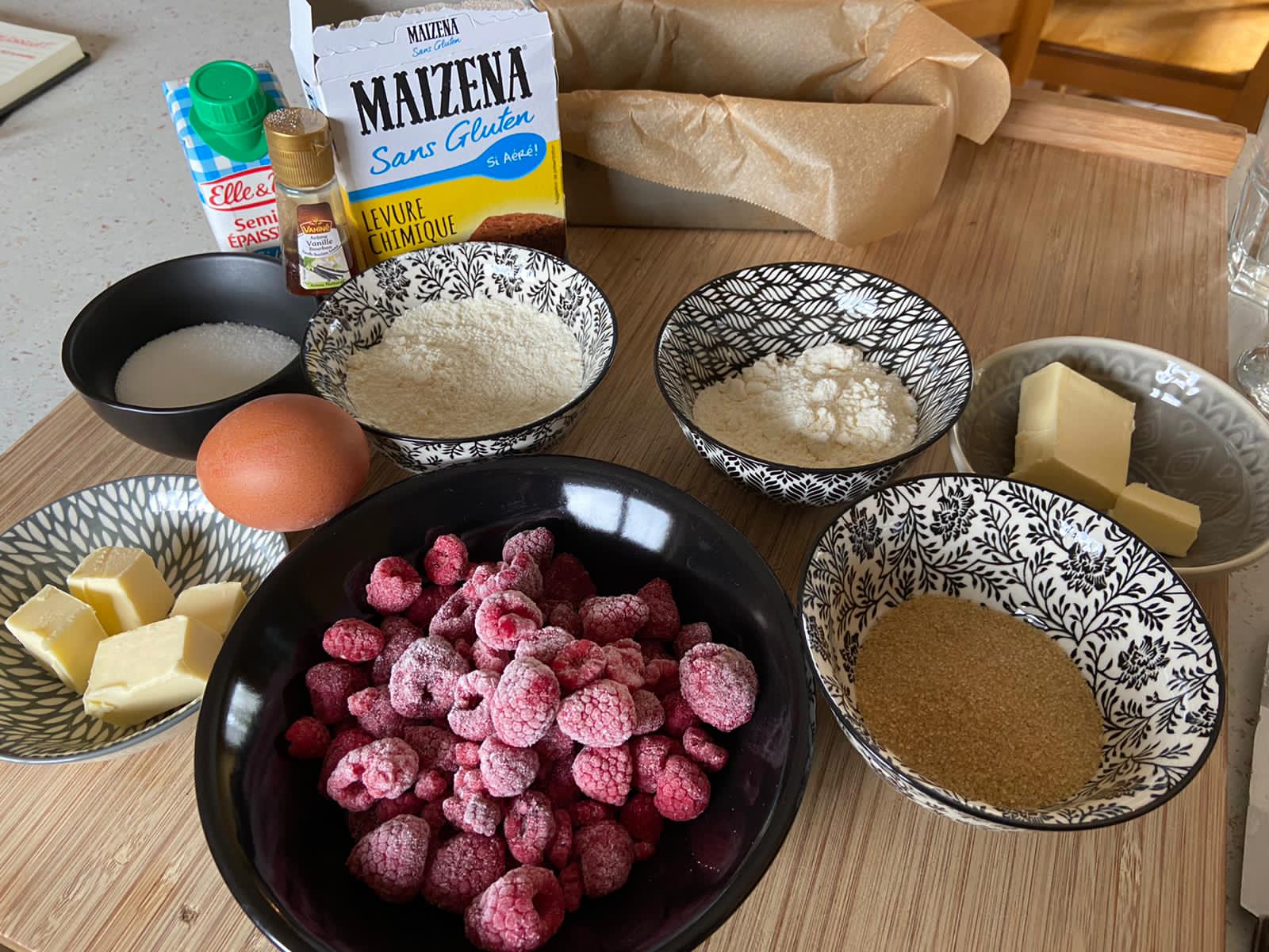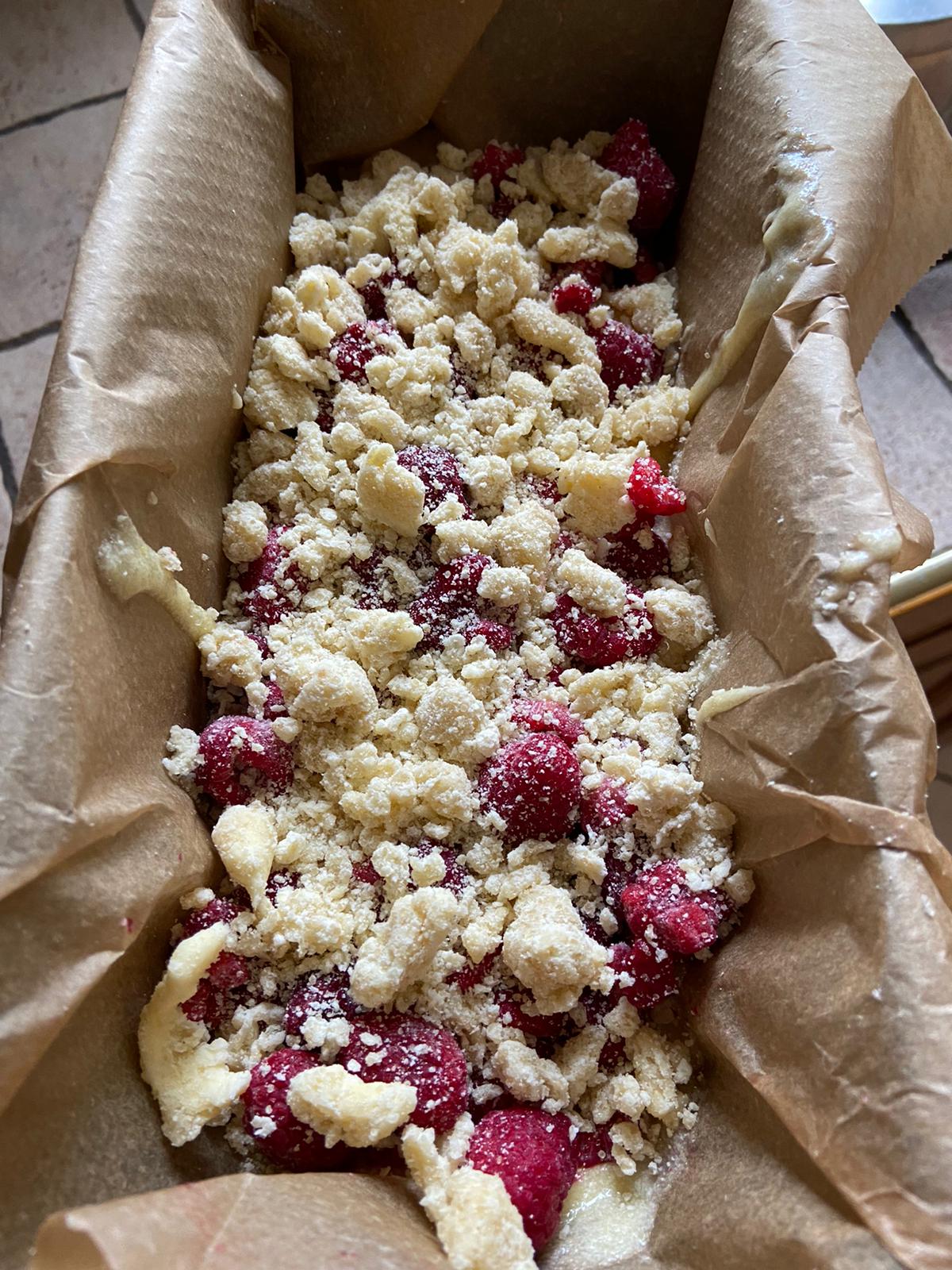 5 Mettre votre petite préparation dans un moule à cake préalablement beurré (ou tapissé d'une feuille de papier cuisson). Rajoutez par dessus les framboises. Enfin émiettez le crumble par dessus.