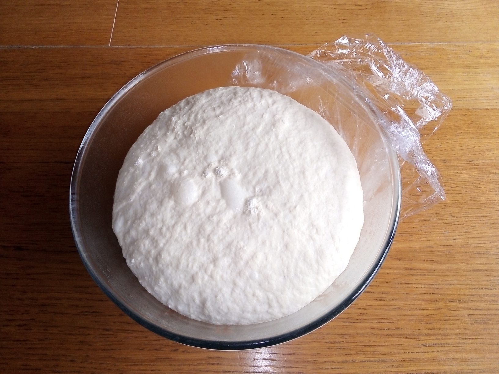 Soit préparer le pâton la veille, laisser une nuit au réfrigérateur (position haute). Le lendemain matin, sortir le saladier, laisser à température ambiante, ne pas retirer le film étirable.....