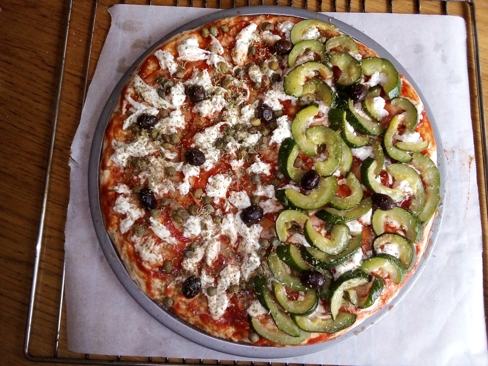 J'avais une courgette que j ai faite revenir dans de l'huile d'olive avec de l'ail, bien l'égoutter, puis disposer sur la moitié de la pizza.